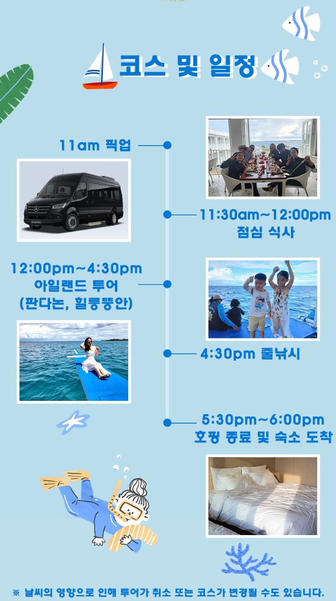 (최소 모객인원이 채워지지 않아 소규모 호핑투어로 진행될 경우, 이용 1~2일전 안내드립니다.)