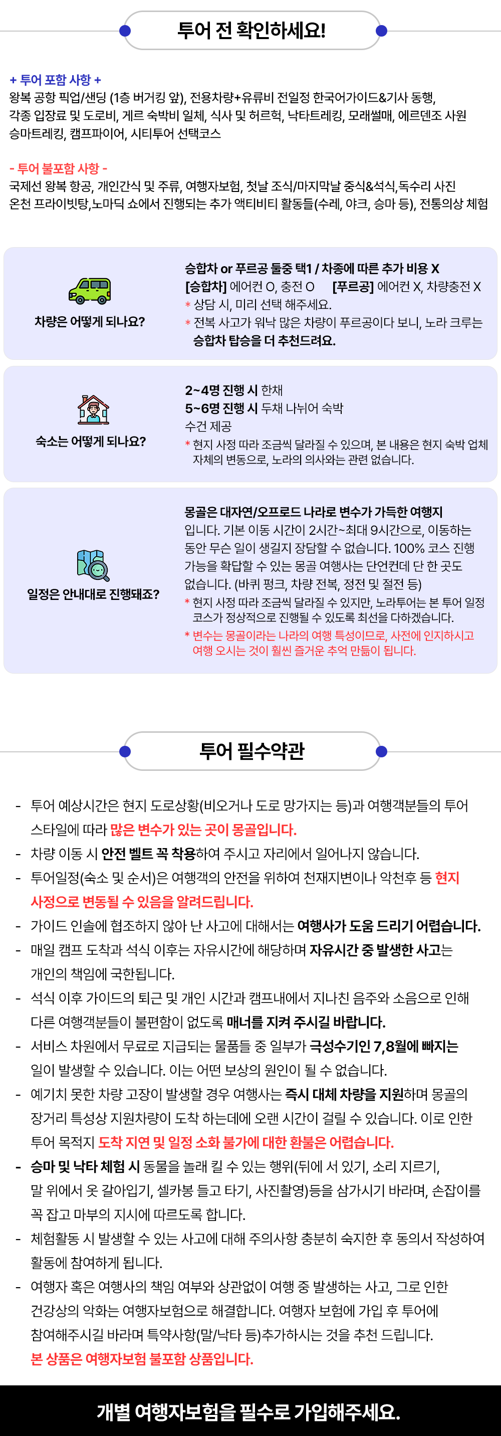 • 여행자 보험 가입 후 투어에 참여하는 것을 권장하며, 특약 사항(말/낙타 체험 시 보상)을 추가하는 것을 추천합니다. 본 상품은 여행자 보험이 포함되지 않은 상품입니다.