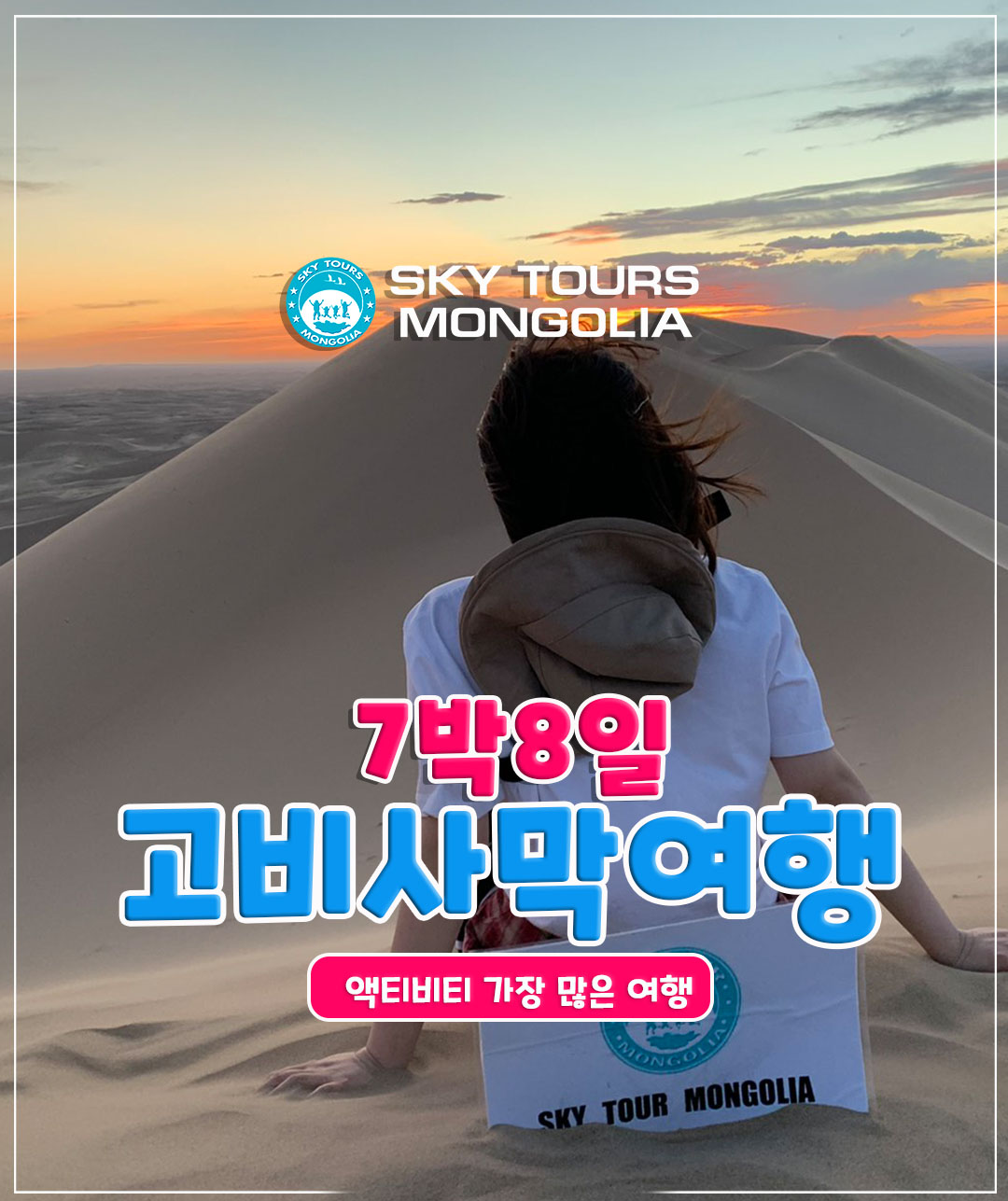 [투어 소개] 7박 8일 몽골 고비사막과 테를지 여행입니다. • 액티비티/망원경 체험 , 낙타, 승마, 아르아발 사원, 모래 썰매, 거북이 바위, 독수리 체험, 칭기스칸 동상, 몽골 전통적인 음식 호르혹, 야외 삼겹살, 게르 체험, 아름다운 별 감상, 은하수와 푸른 초원과 함께 아름다운 몽골 여행입니다./ [투어 코스] Day 1 : 바가가자링 촐로 Day 3 : 욜링암 (승마 체험) Day 4 : 홍고린엘스 (낙타 트래킹, 샌딩 보드 체험) Day 5 : 홍고린엘스 (호르혹 체험) Day 5 : 바양자그 (아름다운 별 감상) Day 6 :차강소브라그 ( 트레이킹) Day 7 : 테를지 (칭기스칸 동상, 독수리 체험, 아르야발 사원, 거북이 바위 구경, 망원경 체험) Day 8 : 공항 흑은 울란바토르 (캐시미어 알렛 구경, 자이상 타워 구경)