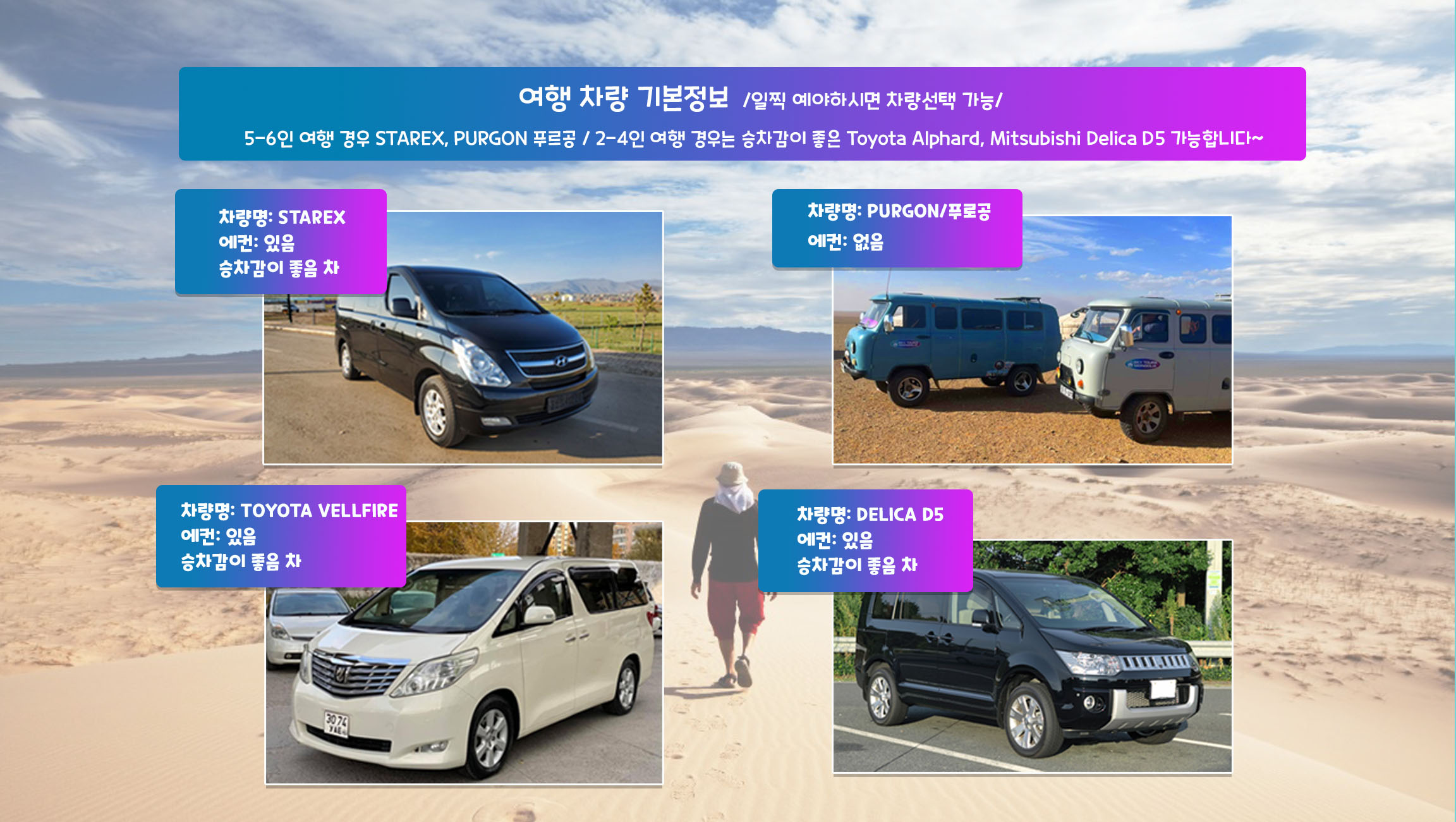 ※ 투어 인원수 최소 2명부터 진행 가능합니다. ※ 공항에 최소 몇시까지는 도착해야 당일부터 시작할 수 있습니까? 고항에 새벽부터 14:00까지 도착하셔야 당일부터 여행 가능합니다 ~ [숙소 안내] * 숙소가 여행자님이 편히 쉬고 갈 수 있는 관광객을 위한 현대식 게르/하우스입니다. * 게르 숙소는 6인 1실, 4인 1실, 2인 1실 / 게르 숙소는 2~6인실 - 인원에 따른 배정 / 남녀 분리 숙박이 원칙이나, 상황에 따라 1인 단독 또는 혼숙이 될 수 있습니다. * 전 일정 샤워 가능합니다. * 전 일정 전기 사용 가능합니다. [차량 안내] * 차량 1~2명의 경우 Prius Toyota, Sai,Vanguard, Harrier * 차량 3~4명의 경우, 텔리카, 스타렉스, 러시아 푸르공 이용 * 차량 5~6명의 경우, 러시아 푸르공, 스타렉스 이용 * 별도로 아동 카시트 설치는 불가합니다. [식사안내] * 점심 식사는 현지 식당에서 먹고 아침과 저녁을 가이드님이 준비해서 만들어 드립니다. 저녁은 삼겹살, 유목민의 전통 음식 호르혹(몽골 바베큐), 몽골 칼국수, 몽골 초이방(몽골식 스파게티), 몽골 전통 음식 등이 제공됩니다.