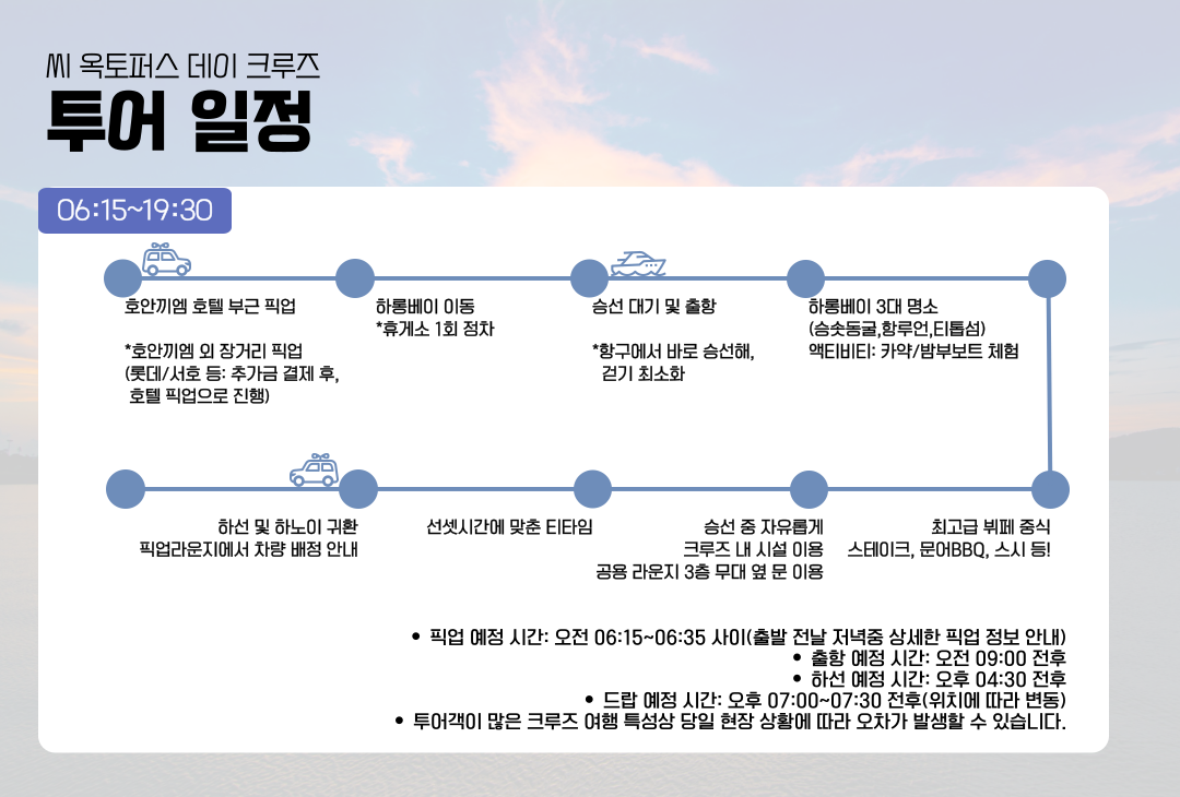 * 지금부터 이하 내용들은, 당일 크루즈 현장 상황에 따라 예고 없이 변경될 수 있습니다.