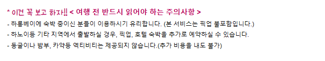 하노이 출발, 하롱베이 도착 후 취소시 | 제공된 서비스(차량 등)비용 공제 후 환불 |