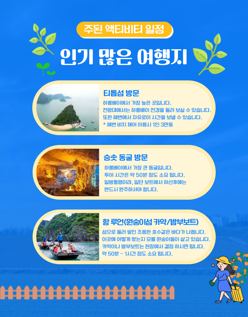 • 승솟동굴, 티톱섬, 항 루언등 하롱베이의 유명 3대 관광명소를 모두 방문 원하시는 분
