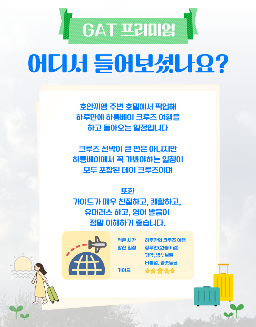 친절하고, 쾌활하며, 영어 발음이 뛰어남과 유머러스함까지 챙긴 가이드분과 함께 하고싶으신분들은 GAT 프리미엄 크루즈 추천드립니다!
