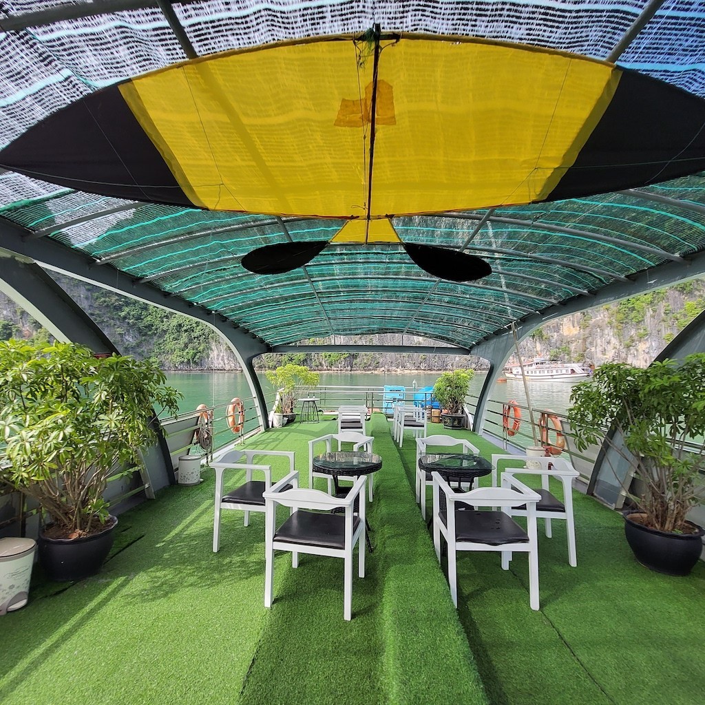 하롱베이 선착장 도착 후, 가이드의 안내에 따라 승선합니다. 보트는 크고 화려하지 않지만, 시설도 깔끔하고 에어컨도 빵빵하게 잘 나옵니다. (아래 사진을 누르면 크게 확대 됩니다) 2층 선데크에는 그늘막과 바닥에 인조잔디가 깔려있어 무척 쾌적합니다