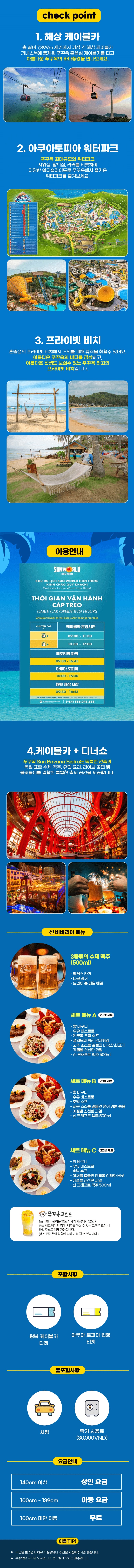 - 개별 여행자 보험에 가입을 권장드립니다. - 수건을 빌리면 대여료가 발생되니, 수건을 지참해주시면 좋습니다. - 푸꾸옥은 뜨거운 도시입니다. 썬크림과 모자는 필수입니다.  ◼ 참여 가능 연령 (140cm 이상) 성인 (100cm~139cm) 아동 (100cm 미만) 무료아동