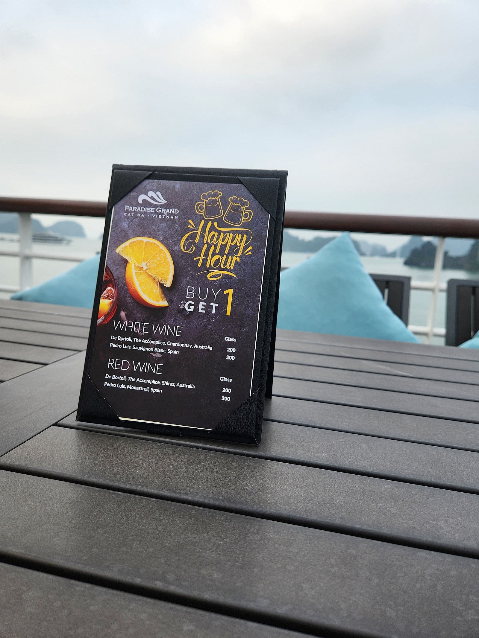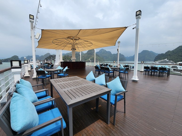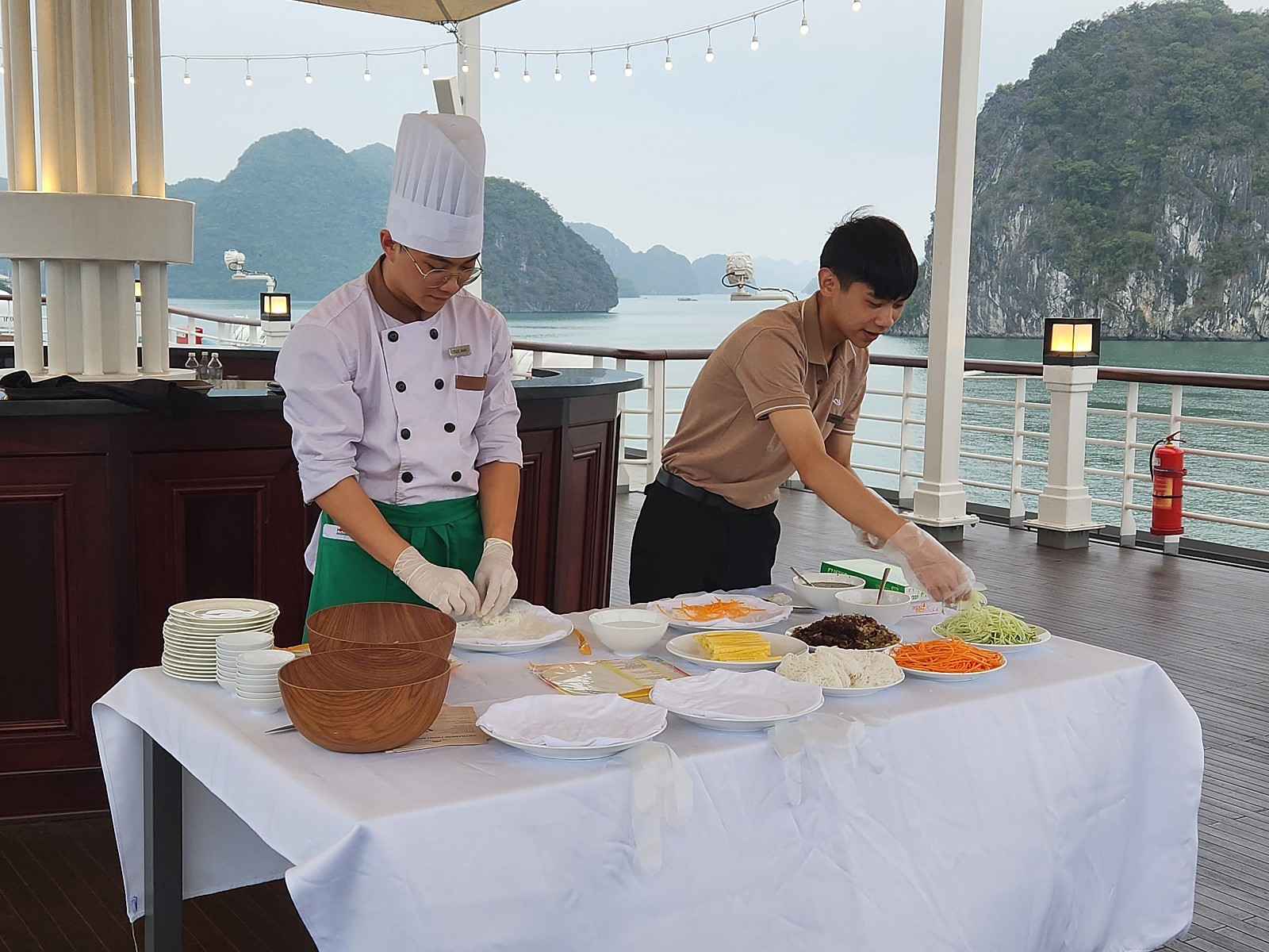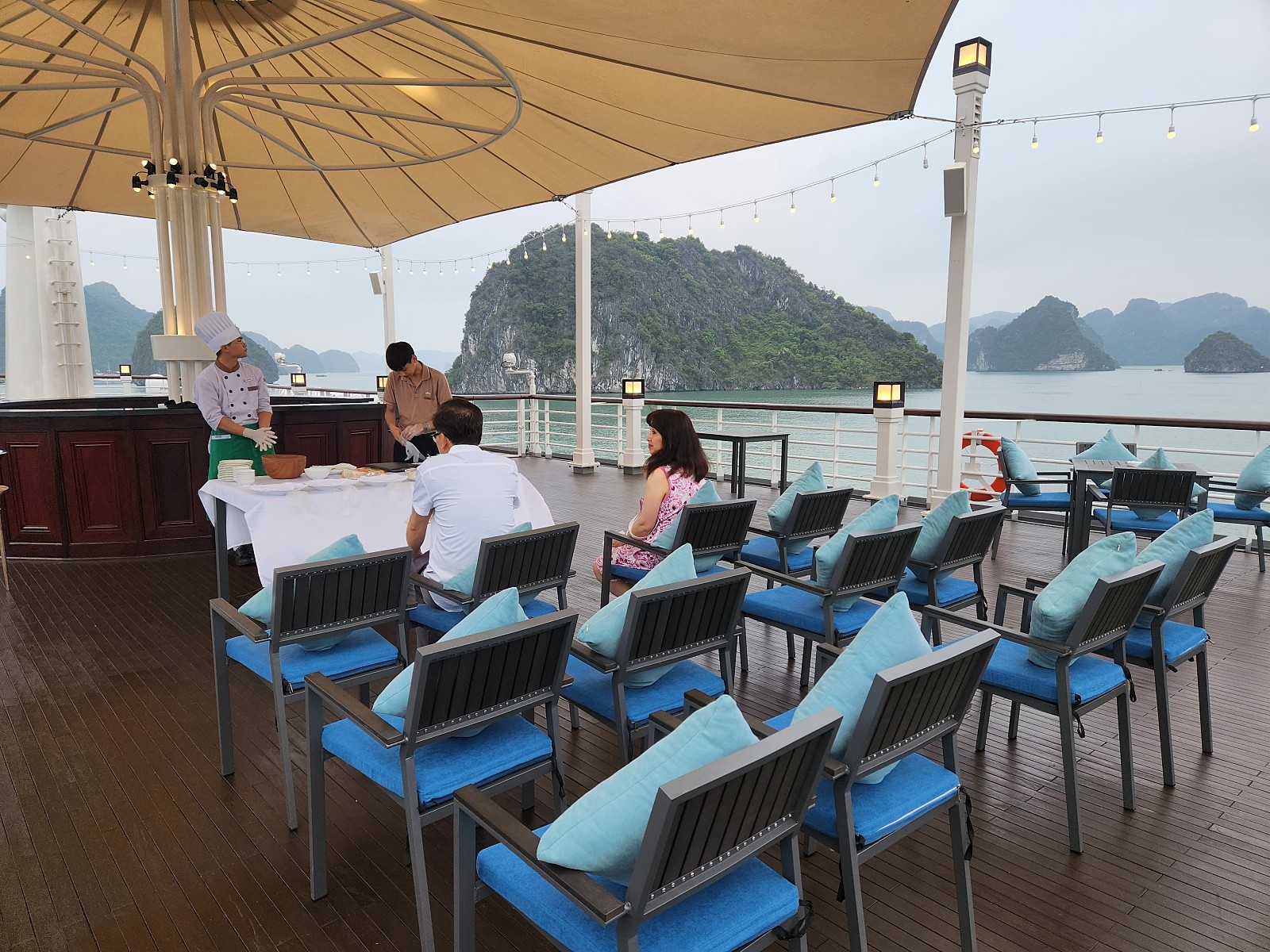 모든 투어가 끝난 뒤 4층 선덱에서 선셋 파티와 쿠킹 클래스가 진행됩니다. 음료 행사와 무료로 간식 거리가 제공되며 이후 선덱에서 해피아우어(음료 1+1행사), 쿠킹클래스가 진행됩니다. 시원한 하롱베이 바닷바람을 맞으며 맛있는 음료 한잔으로 분위기를 띄우고 베트남 음식을 만들어보는 시간을 가질 수 있습니다. 특히 이시간대에 선덱에 설치된 자꾸지에서 시간을 보내시는것도 좋은 방법입니다.