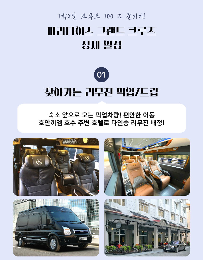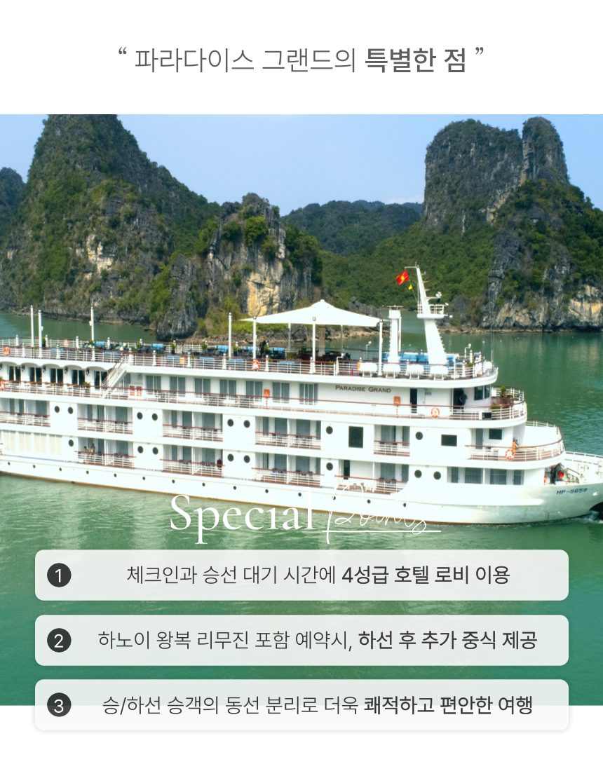하노이 - 하롱베이 편도 2시간 30분 정도 소요됩니다. 파라다이스 그룹의 호텔, 파라다이스 스윗 호텔 도착 후 체크인을 진행합니다. 체크인은 Saigon 건물에서 이루어지며, 각 파라다이스 엘레강스, 그랜드 크루즈의 체크인 장소입니다. 건물을 바라보고 각 왼쪽 입구와 오른쪽 입구입니다. ( 파라다이스 그랜드는 오른쪽 입니다.) 하롱베이에서 합류하시는 경우, 이곳으로 오전 11:30까지 방문 하시면 됩니다. 보딩 타임은 12시 ~ 12시 30분 이기에 그때까지 호텔 내/외부에서 휴식을 취하고 계시면 됩니다