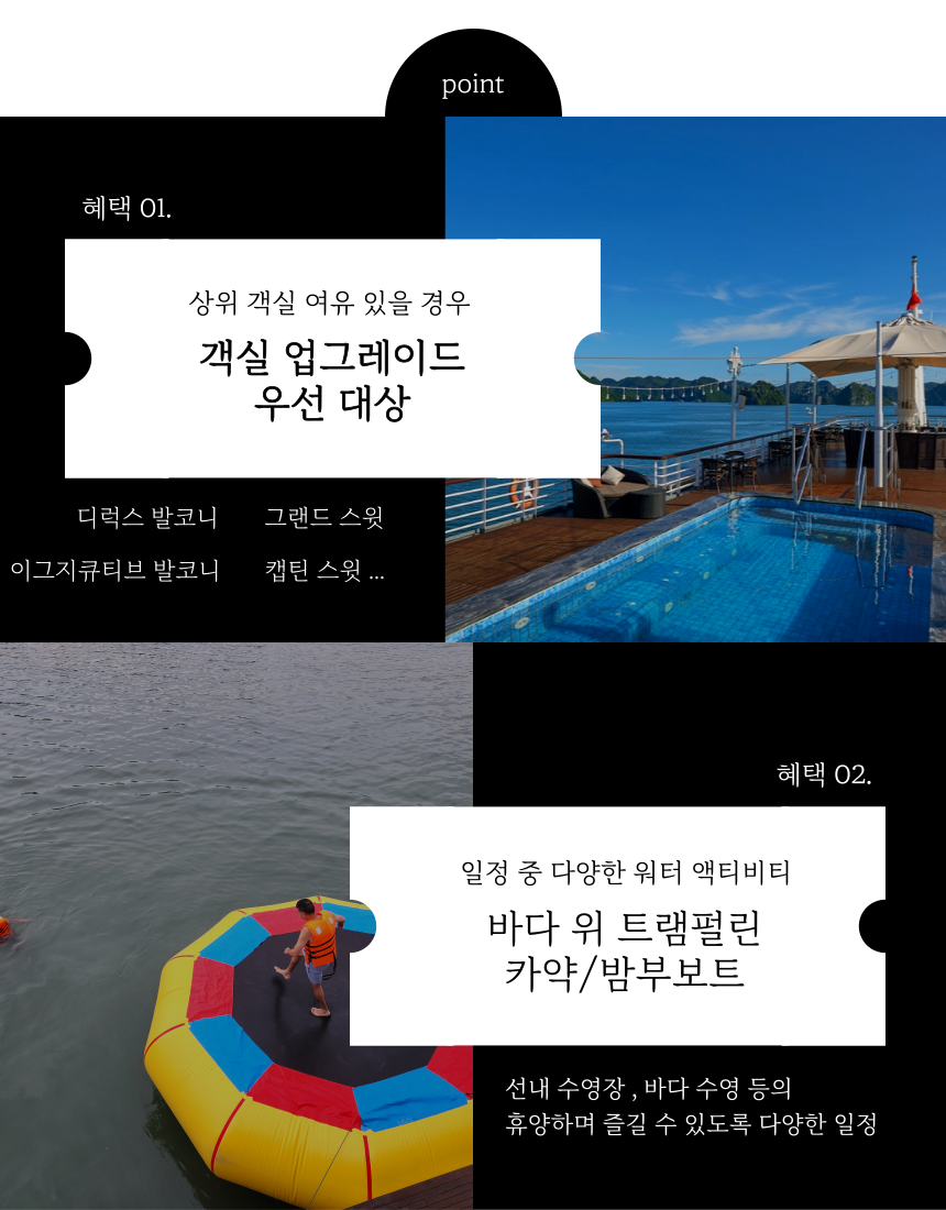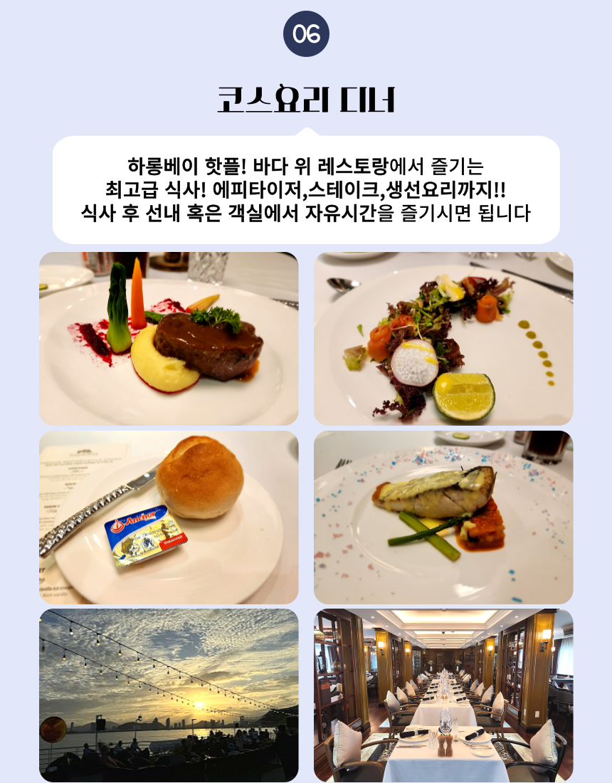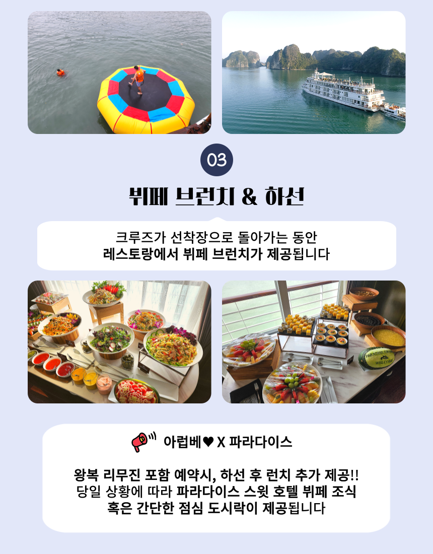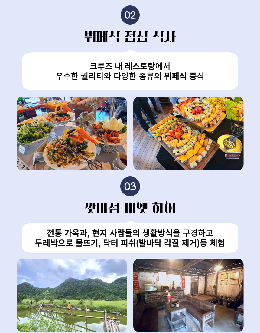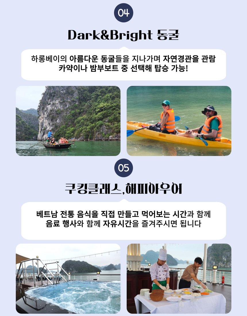 이렇게 상품에 대한 간단한 설명을 드렸구요. 저희 아이러브베트남에서는 정확한 정보 전달을 위해 당연히!!! 짧은 주기로 해당 크루즈를 직접 방문하고 있습니다 ! 주의 ! 저희처럼 상세한 설명이 없다면 직접 다녀오지 않고 판매하는 경우가 많으니 주의하세요 그럼 여행 일정을 세세히 살펴보도록 하겠습니다~ 레츠 고우!!!👉👉 * 지금부터 이하 내용들은, 당일 크루즈 현장 상황에 따라 예고 없이 변경될 수 있습니다.