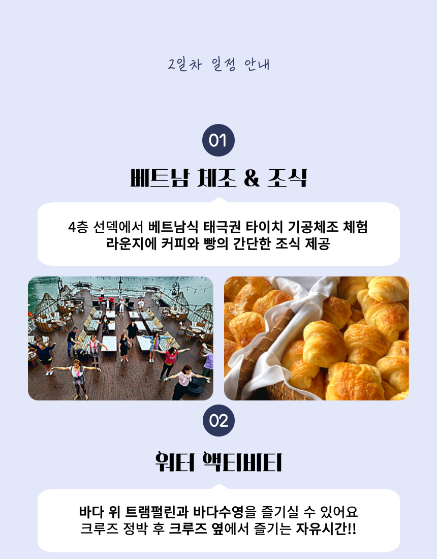 오전 6시, 선덱에서 베트남 체조 시간이 있습니다. 이번엔 탑승객이 적고 지원자도 없어 아쉽게도 진행하지 않았습니다. 이후 간단한 조식이 제공됩니다. 빵과 쿠키, 커피 그리고 티 가 제공되며 아침을 깨우는 시간입니다