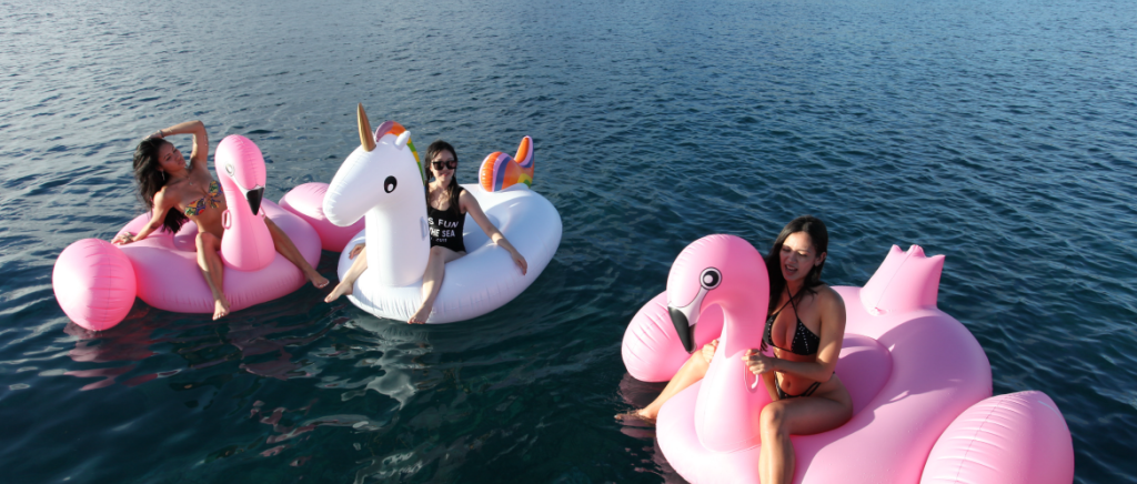 호텔 왕복 픽/드랍 각종 물놀이 장비 - 스노쿨 및 구명조끼 - 홍학 & 유니콘 튜브 - 플로아팅 매트 - 낚시대 각종 먹을거리 - 스시롤 점심식사 (선택시) - 참치회 / 연어회 - 음료 및 맥주 - 각종 과자류