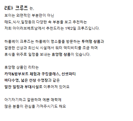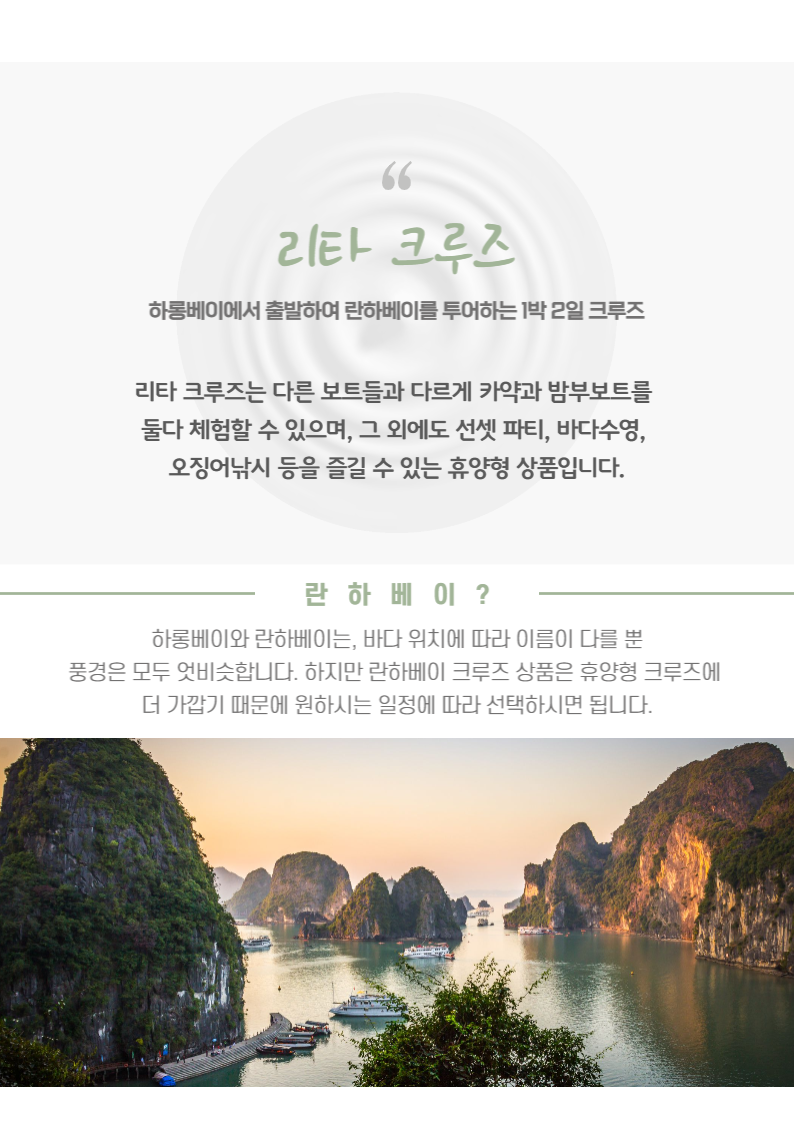 리타 크루즈는 란하베이를 투어하는 휴양형 1박 2일 크루즈 입니다.