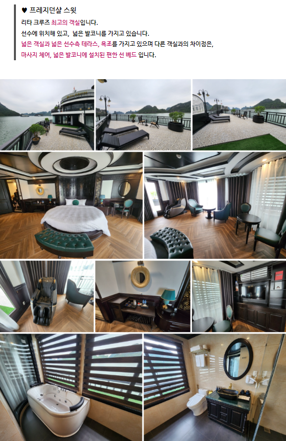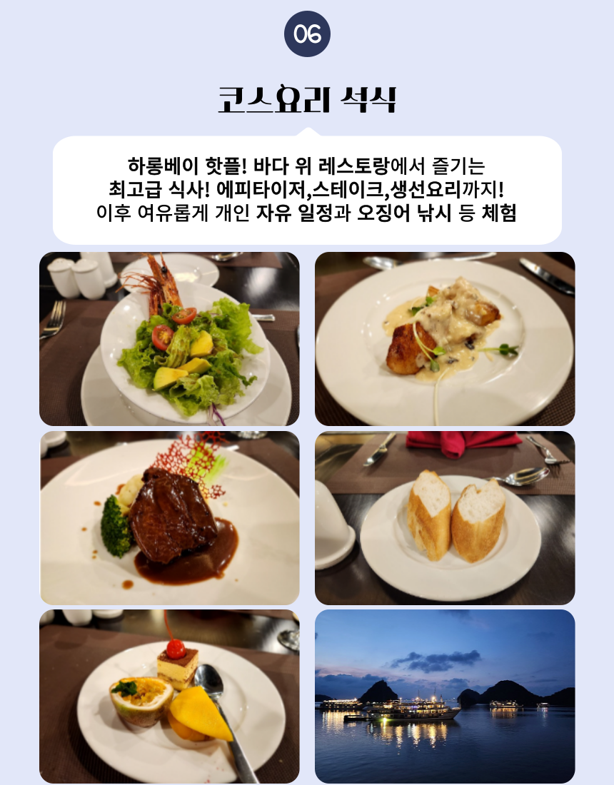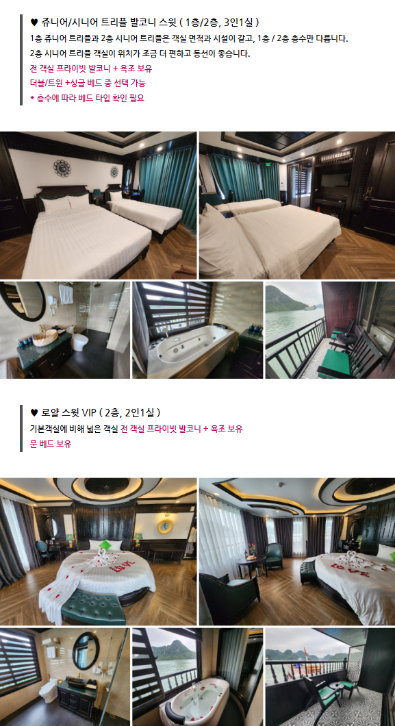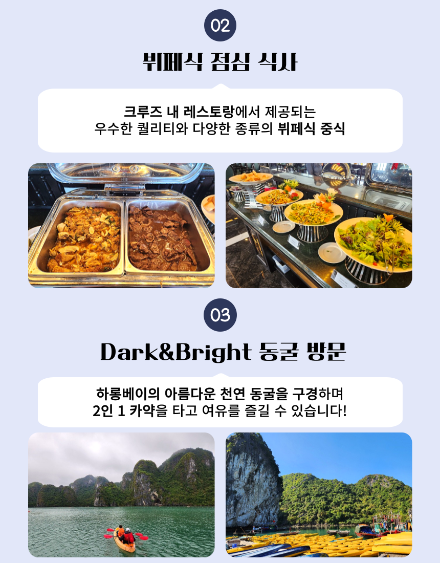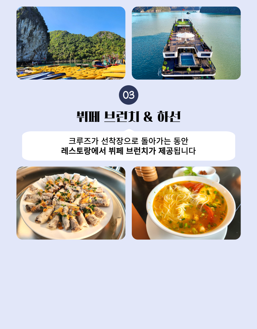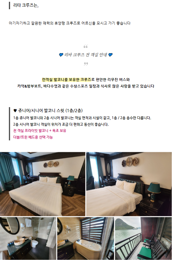 이렇게 상품에 대한 간단한 설명을 드렸구요. 저희 아이러브베트남에서는 정확한 정보 전달을 위해 당연히!!! 짧은 주기로 해당 크루즈를 직접 방문하고 있습니다 ! 주의 ! 저희처럼 상세한 설명이 없다면 직접 다녀오지 않고 판매하는 경우가 많으니 주의하세요 그럼 여행 일정을 세세히 살펴보도록 하겠습니다~ 레츠 고우!!!👉👉 * 지금부터 이하 내용들은, 당일 크루즈 현장 상황에 따라 예고 없이 변경될 수 있습니다.