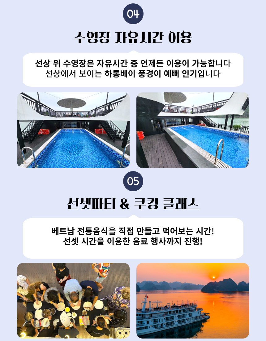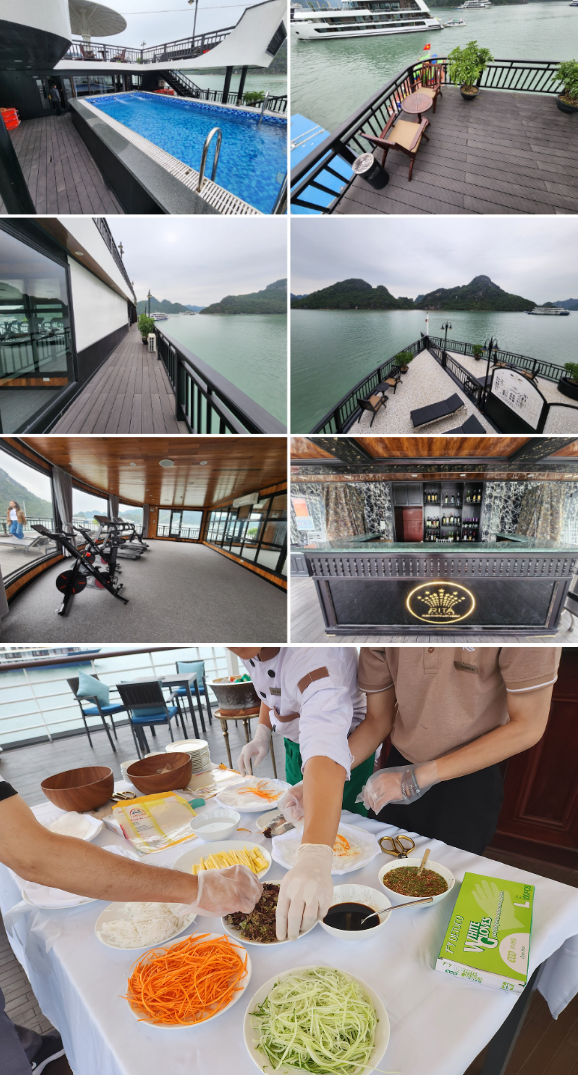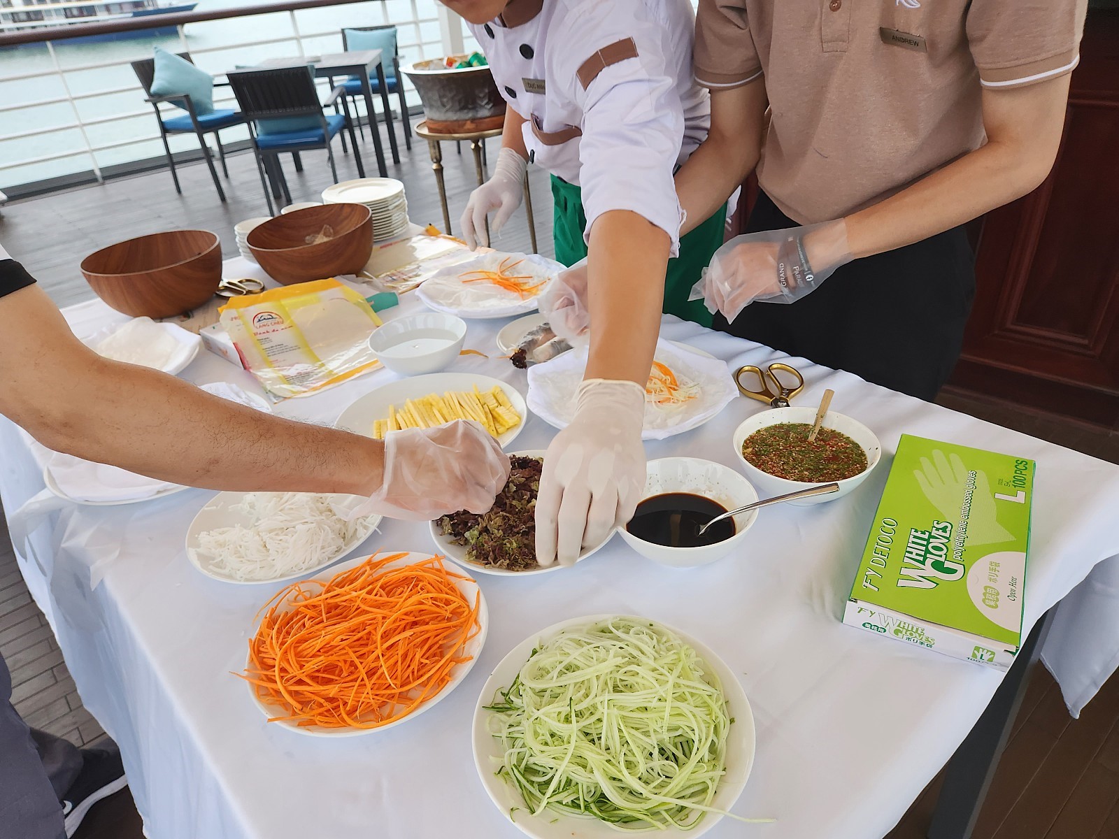 밤부보트 탑승 체험 모든 투어가 끝난 뒤 선덱에서 선셋 파티와 쿠킹 클래스가 진행됩니다. 음료 행사와 무료로 간식 거리가 제공되며 이후 선덱에서 쿠킹클래스가 진행됩니다 시원한 하롱베이 바닷바람을 맞으며 맛있는 음료 한잔으로 분위기를 띄우고 베트남 음식을 만들어보는 시간을 가질 수 있습니다. 특히 이시간대에 선덱에 설치된 자꾸지에서 시간을 보내시는것도 좋은 방법입니다