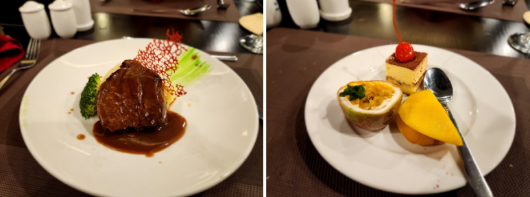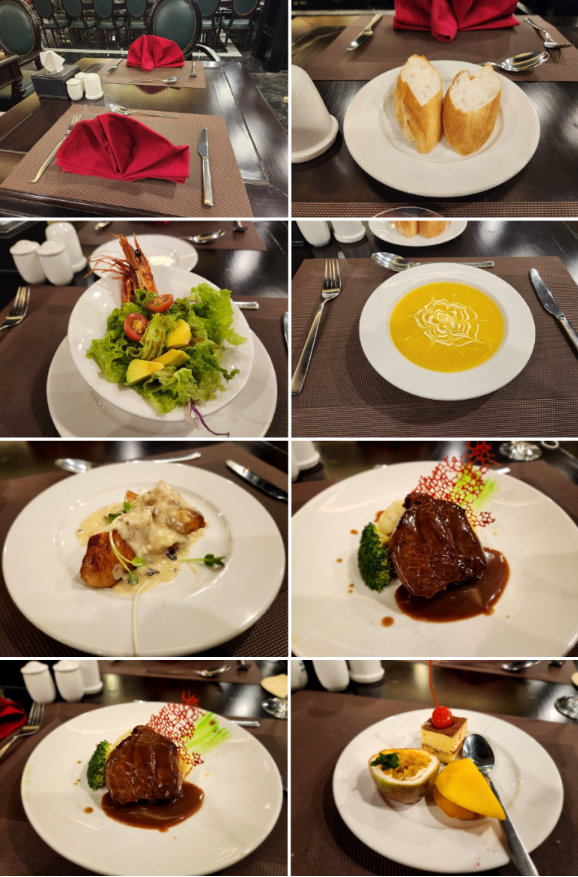 식사 메뉴는 현장 상황에 따라 예고없이 변동될 수 있습니다 오후 7시 경, 대망의 저녁식사가 레스토랑에서 제공됩니다. 크루즈 여행의 가장 중요한 부분을 차지하는 일정이라고 생각합니다. 맛있는 식사가 순서대로 제공됩니다
