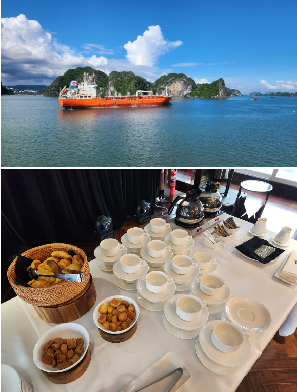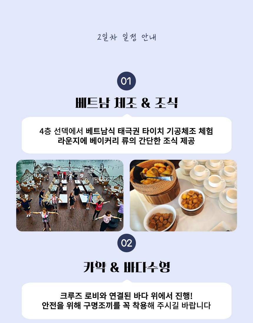 오전 6시, 선덱에서 베트남 체조 시간이 있습니다. 이번엔 탑승객이 적고 지원자도 없어 아쉽게도 진행하지 않았습니다. 이후 간단한 조식이 제공됩니다. 빵과 쿠키, 커피 그리고 티 가 제공되며 아침을 깨우는 시간입니다