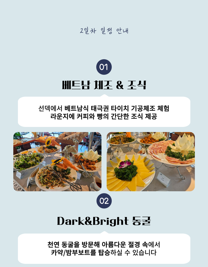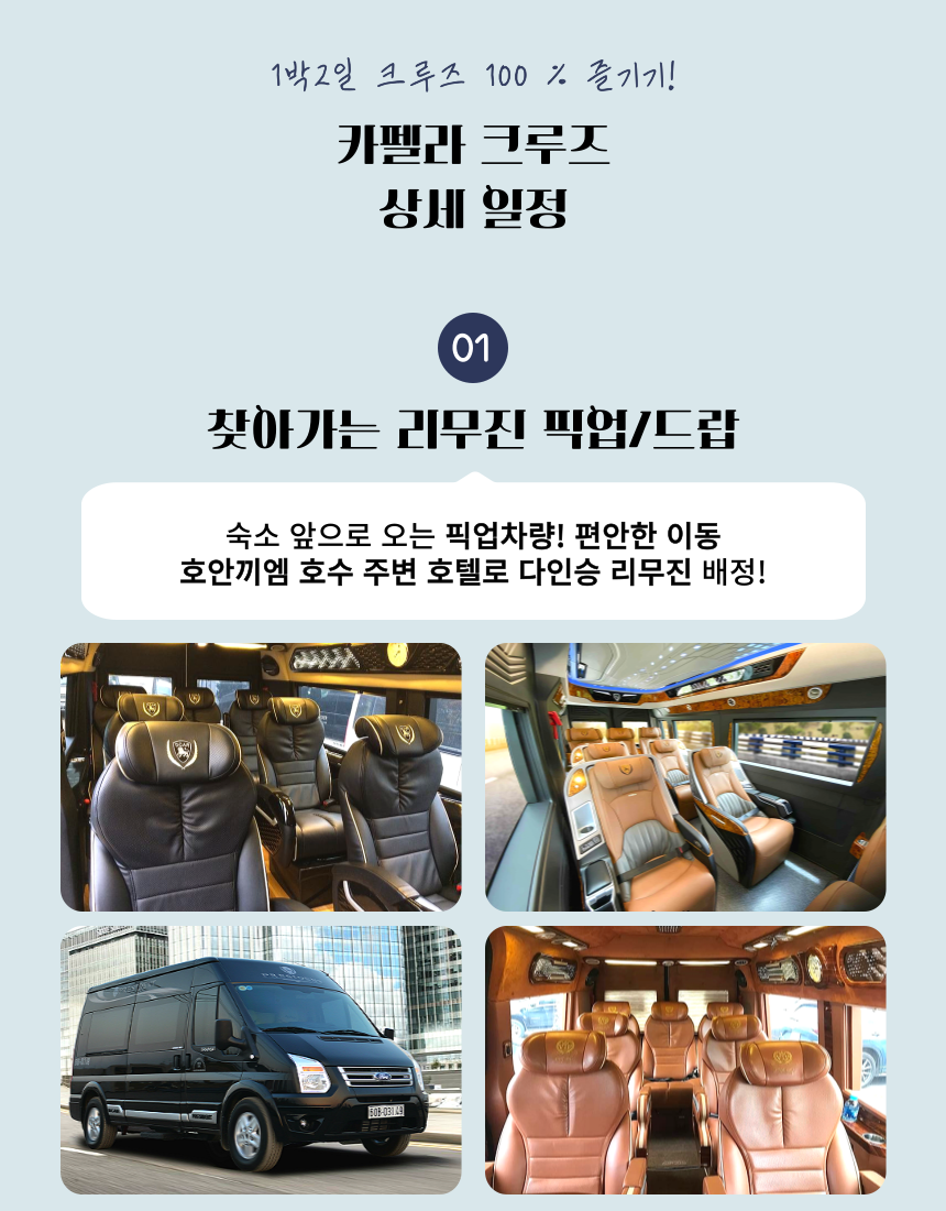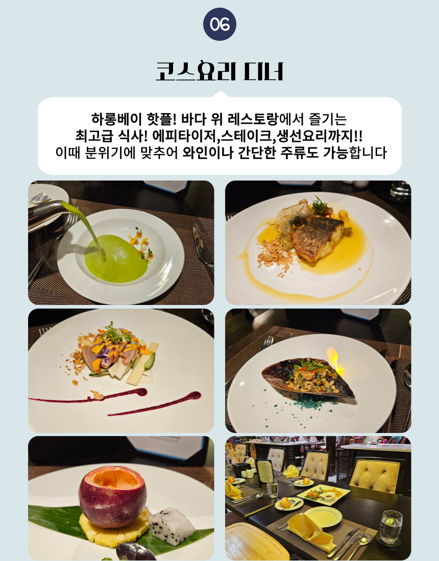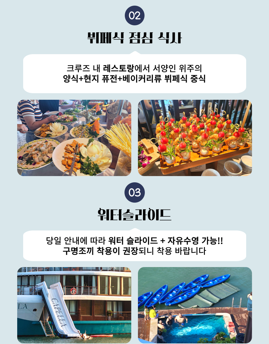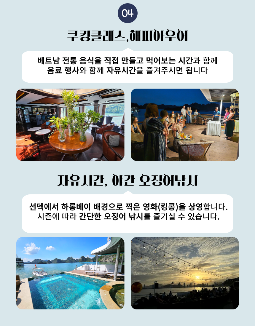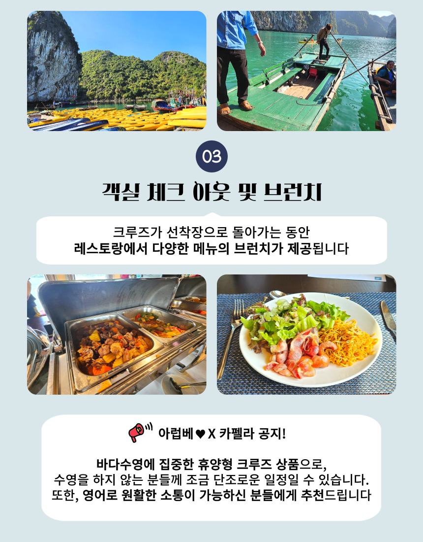 이렇게 상품에 대한 간단한 설명을 드렸구요. 저희 아이러브베트남에서는 정확한 정보 전달을 위해 당연히!!! 짧은 주기로 해당 크루즈를 직접 방문하고 있습니다 ! 주의 ! 저희처럼 상세한 설명이 없다면 직접 다녀오지 않고 판매하는 경우가 많으니 주의하세요 그럼 여행 일정을 세세히 살펴보도록 하겠습니다~ 레츠 고우!!!👉👉 * 지금부터 이하 내용들은, 당일 크루즈 현장 상황에 따라 예고 없이 변경될 수 있습니다.