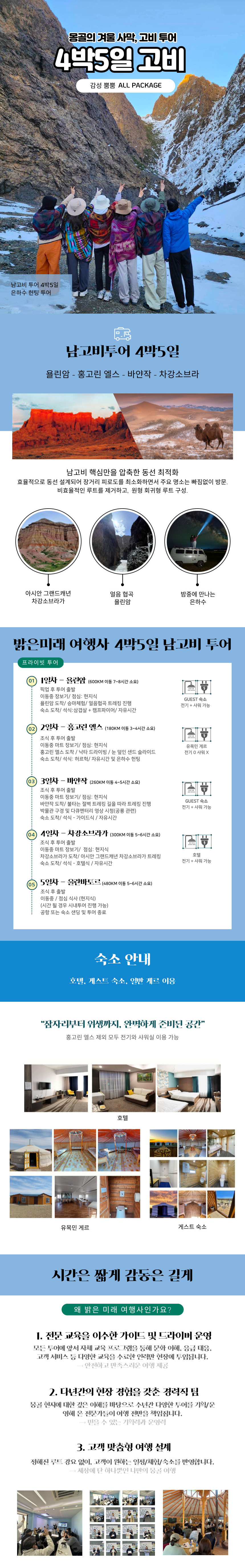 • 몽골 여행 전 국내(대한민국)에서 “여행자 보험” 가입을 권장합니다. (※ 본 상품은 여행자 보험 불포함)