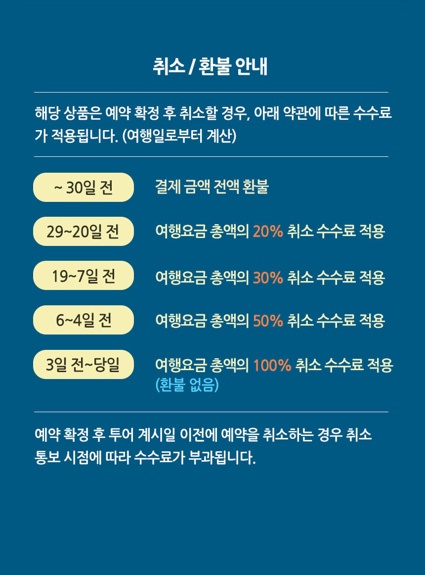 • 투어 상품은 결제 후 예약 확정 여부가 정해지며, 24시간 이내에 확정이 안 될 경우 취소 요청이 가능합니다.